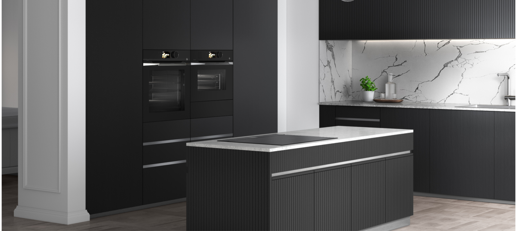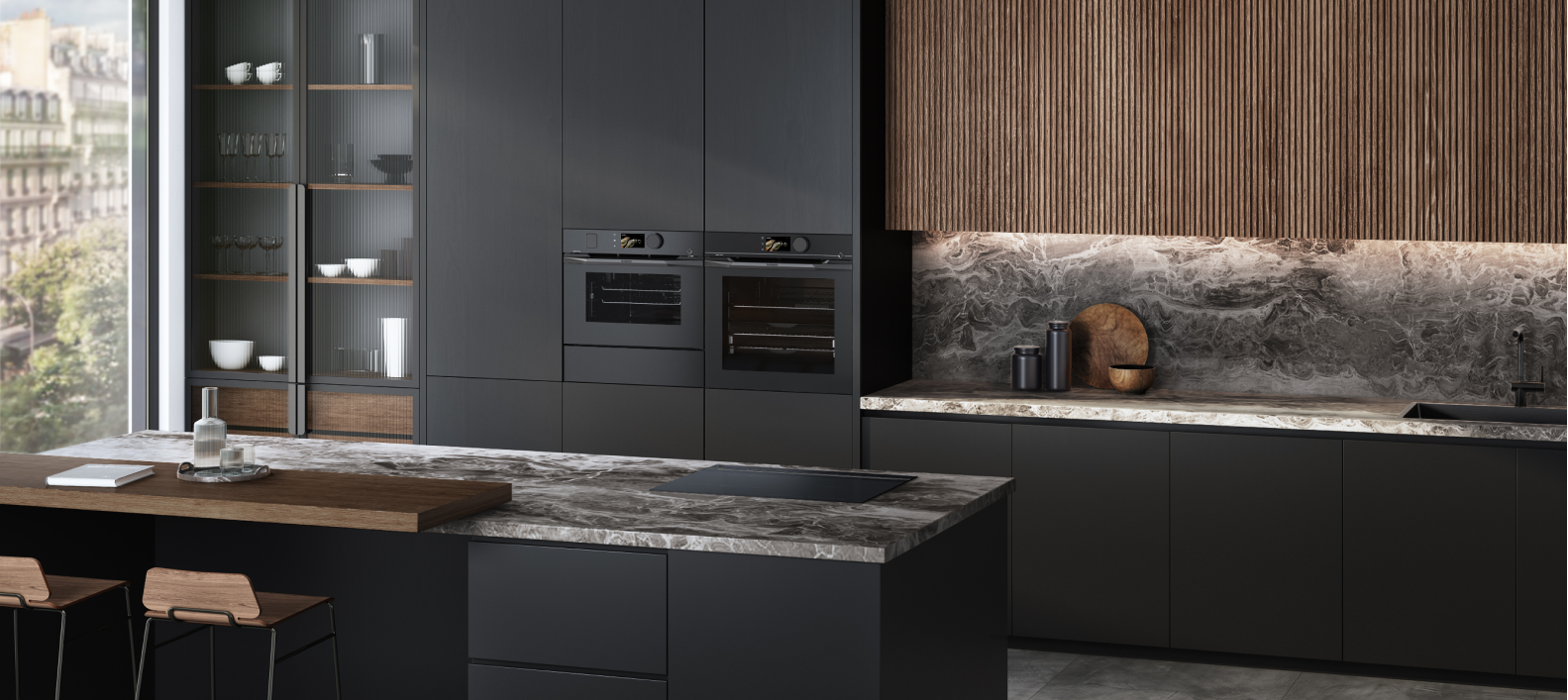 Questa sonata in nero assoluto è punteggiata da lampi di acciaio inossidabile, spazzolato o lucidato a specchio. Un'ispirazione fortemente contemporanea, in cui il metallo dà profondità al nero per esaltare l'artigianalità e la qualità dei materiali.